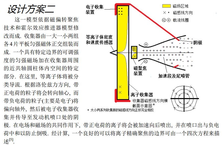 這一事實讓我想起了使用的離子推進器的衛(wèi)星, 如SMART和DAWN衛(wèi)星等. 離子推進器的廣泛應(yīng)用說明了人類在短距離小空間內(nèi)加速離子的技術(shù)日臻成熟. 這也同時讓我考慮到一個新的模型——融合傳統(tǒng)離子推進器和沖壓發(fā)動機的設(shè)計, 讓等離子體代替空氣進入進氣道, 然后使用電場和磁場來加速, 以取代化學(xué)燃料的燃燒. 這就是我的想法的概述.