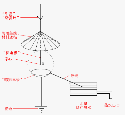如圖7,可以在“雷擊村”,或其他發(fā)生“閃電”較多的區(qū)域,并且遠(yuǎn)離居民區(qū)的地方,放置一些大大小小的“棒電極——球冠電極”。“棒電極”樹立于空中,用于招引閃電,類似于“避雷針”,但必須與其接地的支撐物絕緣,并且深入到“球冠電極”球心的頂端部位,越細(xì)越好——越細(xì)激發(fā)的“球狀閃電”的能量越大?!扒蚬陔姌O”的頂端接地,在其邊沿接一導(dǎo)線引入水槽,在閃電放電時(shí),產(chǎn)生的“球狀閃電”可以沿導(dǎo)線進(jìn)入水槽,“球狀閃電”所含的部分能量——熱能可以加熱水,這樣“閃電”的能量,就可以通過“接轉(zhuǎn)”為“球狀閃電”,再把可以“暫時(shí)儲(chǔ)存能量”的“球狀閃電”的部分能量——熱能傳給水,人們就可以利用熱水用于工業(yè)生產(chǎn)或日常生活了。
