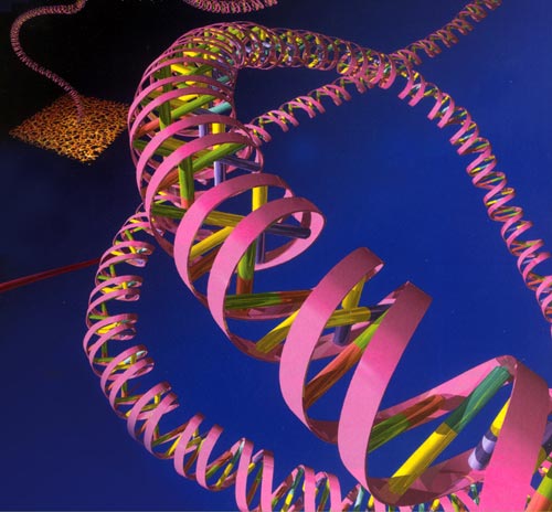 1953年4月25日,世界權(quán)威雜志《自然》雜志發(fā)表了沃森、克里克的一篇900多字優(yōu)美精煉的短文,宣告了DNA分子雙螺旋結(jié)構(gòu)模型的誕生。這個(gè)結(jié)構(gòu)模型的要義是:DNA是一個(gè)長(zhǎng)長(zhǎng)的雙鏈分子,由兩條同軸反向相互纏繞的多核苷酸鏈組成,外側(cè)是由脫氧核糖和磷酸根組成的分子骨架,中間是由互補(bǔ)的堿基對(duì)組成的階梯,堿基配對(duì)方式是A配T,C配G;堿基對(duì)間距為0.34納米,每10個(gè)堿基對(duì)形成一個(gè)螺旋周期,螺旋直徑為1納米。這個(gè)模型既能從螺旋性、分子直徑、堿基對(duì)的幾何學(xué)尺度等方面闡明X射線衍射圖像,又能以堿基專(zhuān)一性互補(bǔ)配對(duì)來(lái)解釋查伽夫當(dāng)量定律。DNA雙螺旋結(jié)構(gòu)是一個(gè)極為成功、無(wú)懈可擊的DNA分子結(jié)構(gòu)模型,它由兩條右旋但反向的鏈在同一個(gè)軸上盤(pán)而成,像一個(gè)螺旋形的梯子,生命的遺傳密碼就列在梯子橫檔上。據(jù)科學(xué)家統(tǒng)計(jì),一個(gè)體細(xì)胞的全部DNA“螺旋樓梯”長(zhǎng)約2米。若將一個(gè)人的全部DNA連接起來(lái),可以在地球和太陽(yáng)之間扯上80個(gè)來(lái)回。 DNA分子雙螺旋結(jié)構(gòu)模型的發(fā)現(xiàn),是生物學(xué)史上的一座里程碑; 1962年,沃森、克里克因發(fā)現(xiàn)DNA分子結(jié)構(gòu),與改進(jìn)了X射線衍射技術(shù)的威爾金斯一起獲得了諾貝爾醫(yī)學(xué)或生理學(xué)獎(jiǎng)。